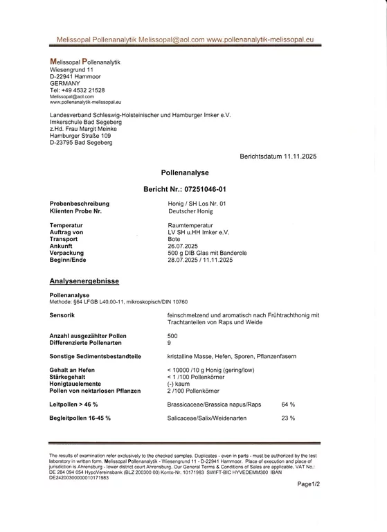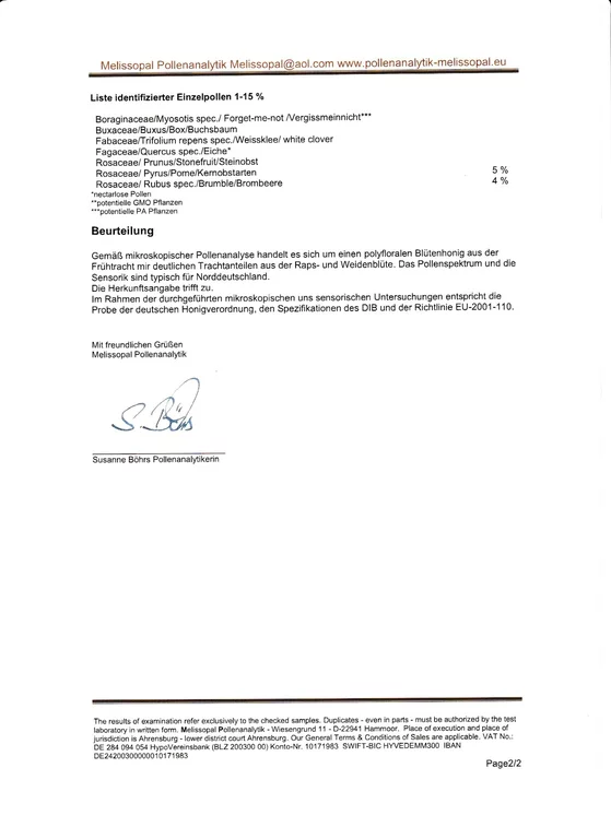 Waldhonig. Leichter Malzgeschmack. Farblich etwas dunkeler als die Sommertracht und weniger süss als der Rapshonig. Streichfähig.
